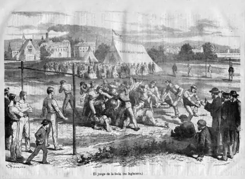 La castellanización de la palabra se produce a principios del siglo XX.[42] El juego de la pelota o balompié, que ya es bastante popular en Inglaterra, aparece por primera vez en una revista gráfica de España en 1868. La revista "El Panorama", publicada en Valencia entre 1867 y 1869, incluyó un pequeño reportaje de curiosidades hablando por primera vez del "football" inglés en su número del 30 de abril de 1868, e incorporando una ilustración gráfica del mismo.[43]