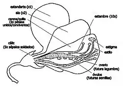 Esquema de una flor de Faboideae (Papilionoideae) y sus componentes; vista lateral.