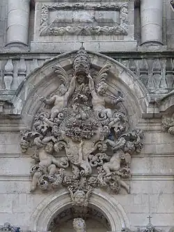 Por encima, un frontispicio, que repite la articulación de la parte inferior, alberga la estatua de la Sabiduría, -una matrona pisando a la ignorancia-, y remata en un ondulante frontón abierto en un óculo.