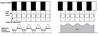 La figura 1 ilustra la combinación de los efectos debidos a la cámara y a la forma del punto de exploración del CRT y la resolución vertical de la imagen de televisión. Es evidente que cuanto mayor sea el número de líneas de exploración, mejor será la calidad de la imagen reproducida.