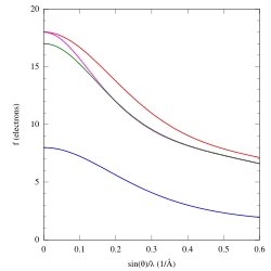 Los valores de los factores atómicos de forma de los átomos e iones para valores de entre 0 y 6 Å|−1 se listan en las Tablas internacionales de cristalografía.[22] Dichos valores se pueden interpolar por una suma de cinco gaussianas:[25]