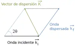 donde es el vector de onda de la onda dispersada y es el vector de dispersión,[n. 1] definido como el vector diferencia entre los vectores de onda de los haces dispersado e incidente: