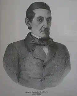 - Julio de Zuviría Lezama[8][9] (ib., 9 de julio de 1825 - pueblo de Belgrano, 15 de octubre de 1877) era un liberal y doctor en jurisprudencia que fue nombrado diputado nacional representando a su provincia en el período de 1862 a 1866. Estaba enlazado desde el 30 de diciembre de 1864, en la iglesia de la Inmaculada Concepción de Buenos Aires, con Trinidad del Corazón de Jesús Ferré Igarzábal (n. Corrientes, 11 de junio de 1849) —una descendiente de catalano-españoles de principios del siglo XIX y de hispano-correntinos coloniales de siglos anteriores— y con quien tuviera solo una hija documentada: María Dolores de la Trinidad Zuviría Ferré (n. Buenos Aires, 17 de agosto de 1866).