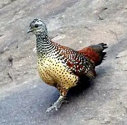 El faisancillo moteado[2] (Galloperdix lunulata) es una especie de ave galliforme de la familia Phasianidae endémica de la India. Los machos tienen el plumaje de las partes superiores castaño densamente moteado en blanco, a diferencia de las hembras, que son de tonos menos intensos y carecen de las motas. Los machos tienen de dos a cuatro espolones mientras que las hembras pueden tener solo uno o dos en sus tarsos. Se encuentra principalmente en hábitats forestales rocosos y con matorral, a diferencia del faisancillo rojo. Suele estar en el sotobosque en parejas o pequeños grupos, y cuando se asusta sale corriendo y rara vez emprendie el vuelo.