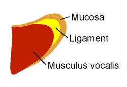Sin embargo, la función de la voz de cabeza se produce a través de una función especializada de los labios vocales. En la voz de cabeza, solo la capa mucosa de la laringe vibra, mientras que el músculo vocal y el ligamiento (las "cuerdas vocales") quedan inmóviles. Esa función es la base para un buen piano y un agudo controlado.