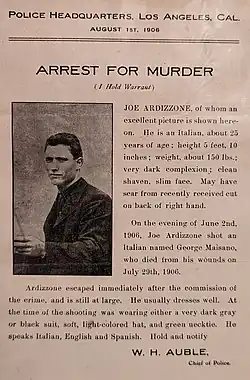 Cuando el destacado líder de la Mano Negra Joseph Ardizzone se vio envuelto en una disputa con George Maisano, miembro de la banda Matranga, ambos acudieron a Joseph Cuccia para que mediara en la disputa. Cuccia era un criminal muy respetado entre los bajos fondos, que servía de traductor en los tribunales para los italianos que no hablaban inglés.[7] Esto le convirtió en un hombre muy querido en la comunidad italiana. Cuccia era pariente de Ardizzone y gobernaba a su favor, lo que hizo que los Matrangas amenazaran a Cuccia. En respuesta, Ardizzone disparó y mató a Maisano el 2 de julio de 1906.[8] Ardizzone huyó entonces de las autoridades y se convirtió en un fugitivo buscado.