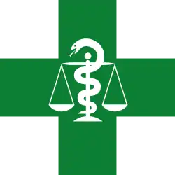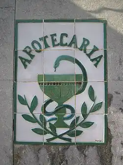 La farmacia está representada por muchos símbolos. Los más comunes en Argentina, España y Francia son la Copa de Higía, la cruz griega verde o la cruz pateada, este último especialmente en los luminosos de las oficinas de farmacia. También existen otros como el mortero y la maza, el carácter de receta, ℞(recipere), medidas cónicas, caduceos, Vara de Esculapio o una A roja gótica y estilizada en el caso de Alemania. La A proviene de Apotheke, vocablo germano de Farmacia.