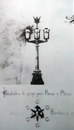 Para el proyecto, el arquitecto reusense elaboró una extensa memoria titulada Candelabro. Apuntes descriptivos del proyecto de candelabros de grupo para plazas y paseos de la ciudad de Barcelona, presentada en junio de 1878. La acompañaba de una acuarela a escala 1:10 con la planta y el alzado, actualmente perdida.[7] De estilo ampuloso y con ciertos errores de ortografía, comienza refiriéndose a proyectos ornamentales de toda la historia, desde Atenas y Roma hasta San Marcos de Venecia y San Pedro del Vaticano. También explica la simbología del proyecto, relacionando el Comercio con la ciudad de Barcelona, que menciona como fundada por los griegos y a la que depara un gran futuro «a causa de la apertura de la comunicación entre el Mediterráneo con el mar de la India» (canal de Suez, inaugurado nueve años antes).[8]