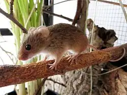 Lc: 4,8-7,5 cm; L: 3,9-6,5 cm; P: 6-15 g. El múrido de menor tamaño. Rostro corto, hocico romo y orejas redondas, visibles entre el pelaje. El rasgo más característico de la especie es la cola prensil, característica de un animal trepador. De color similar al de otros múridos, castaño rojizo en la parte dorsal y blanco en la parte ventral. |