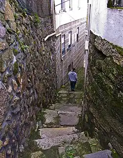 - Coexistencia no armoniosa de órdenes y estilos arquitectónicos, y mezcla de materiales constructivos de mala calidad o en mal estado: Es frecuente que junto a casas tradicionales de piedra de varios siglos de antigüedad se levanten edificios sin ventanas en sus laterales, o que se dejen fachadas del XIX con ladrillo hueco sin enlucir o con fibrocemento (que es un popular tejado de placa ondulada de cemento) sin tratar ni pintar. Otra característica es la mezcla de materiales: por ejemplo, un primer piso de piedra, una segunda altura en bloques de hormigón y una tercera en ladrillo hueco con cubierta de fibrocemento. También puede ser la construcción de un hórreo de ladrillo hueco y bloque con restos de chatarra a la vista como parte del catálogo de materiales, por ejemplo.
