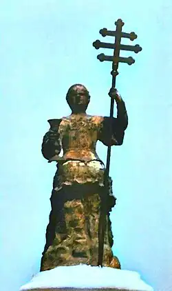 Luis Antonio Toledo, nacido en San Cristóbal de La Laguna (Canarias, España), recibió por su parte la tarea de fundir en bronce la escultura de López además del cometido de facturar dos campanas y ocho veletas. La fase de vaciado comenzó en septiembre de 1769 y el proceso fue realizado en dos partes: con ayuda de un oficial y dos peones, Toledo fabricó con adobes un horno de grandes dimensiones en cuyo interior, calentado con leña, llevó a cabo la fundición mediante el método de moldeo a la cera perdida. Para la creación de la escultura se necesitaron en total 99 arrobas, 11 libras de cobre, 5 arrobas de estaño y otras 5 de plomo, debiendo añadirse 2 arrobas y 17 libras de plomo para ajustar la «división de ella y un paño de cobre», además de para cubrir los defectos propios de la fundición. Posteriormente, Toledo contrató a otro oficial con el fin de que puliese la obra, completándose el proceso con la fabricación de una platina, unos barretones y «la vara de hierro para la cruz que tiene en una mano», todo ello realizado por el herrero Juan Crisóstomo López.[2]: 533 Cabe destacar que en el folio 93 del tomo XIII del Archivo General de la Nación consta que el 5 de septiembre de 1769 Toledo cobró 50 pesos por su trabajo en la estatua y en las campanas, figurando a su vez otro cobro de 50 pesos el 25 de septiembre destinado a la compra de leña y otros materiales «para habilitar las fundiciones de la estatua y de las campanas». También en este mismo folio del archivo aparece registrado el 16 de octubre un pago de 50 pesos a Toledo por parte del mayordomo de la catedral para la compra de cera y sebo así como un recibo de 30 pesos extendido por el artista el 15 de diciembre en el que añadió la siguiente anotación: «El 16 de enero 1770, 70 pesos» (estas dos cantidades fueron destinadas a la fundición tanto de la escultura como de las campanas).[4]: 109 Las obras terminaron en el mes de junio de 1770, cobrando Toledo por la estatua la suma de 335 pesos a razón de 6 reales la libra y por las veletas, «hechas a todo costo» y con chapa de cobre, un total de 32 pesos. De la policromía y el dorado de la escultura se encargó el propio López, quien también pintó y doró las veletas, las muestras del reloj, las barandillas de las cornisas (con un coste de 196 pesos y facturadas por el maestro herrero José Ignacio Rodríguez, quien adquirió el hierro en planchuelas a una empresa de La Guaira) y el enrejado de las campanas, percibiendo por esta tarea 93 pesos y 7 reales, cantidad en la que se incluía el coste de 22 libros de oro; debido a que este pago fue recibido por López el 28 de septiembre de 1770, se suele considerar esta fecha como la data de fin de los trabajos.[2]: 533