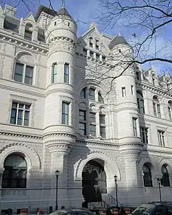 El edificio es un ejemplo de arquitectura de estilo neorrománico y es un componente destacado del complejo del Centro Municipal. La parte original del edificio tiene cuatro pisos y la adición de 1933, siete. El exterior se ha mantenido prácticamente sin cambios. La estructura central tiene formas simples y fuertes con poderosos arcos que dominan el primer piso. Las buhardillas elaboradas, el techo de hierro con cresta, los techos inclinados y una torre le dan al edificio una cualidad pintoresca.[3]