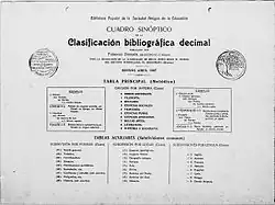 1909 Escribe Cuadros sinópticos de la clasificación decimal universal, Ministerio de Obras Públicas, 8 p.[18]