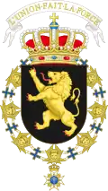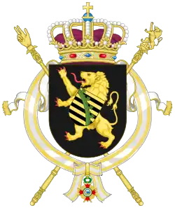 De sable, un león rampante en oro, armado y linguado de gules (Bélgica), en el hombro un escudo cortado de diez barras de sable y oro, cargada de un crancelín de sinople en banda (Casa de Wettin), sobre el un lambel de tres puntas de gules, en la punta central una corona real en oro.