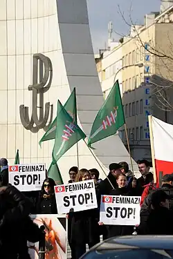 El término feminazi se usa con un sentido peyorativo en contra del feminismo en general o en contra de algunas feministas en particular, sobre todo de aquellas a las que se percibe como «radicales», con el argumento de que el feminismo no busca la igualdad entre hombres y mujeres.[1][2][3] Su uso fue popularizado en 1992 por Rush Limbaugh, un locutor de radio y comentarista político conservador estadounidense.[4]