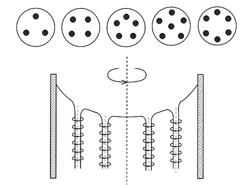 Cuando el helio superfluido es puesto en rotación la Eq.(25) no será satisfecha por todos los bucles dentro del líquido a menos que la rotación esté organizada alrededor de líneas de vortex como se muestra en la Fig.2. Estas líneas tienen un núcleo vacío con un diámetro aproximado de 1 Å (¡que es más pequeño que la distancia media entre partículas!). El helio superfluido rota alrededor del núcleo a muy altas velocidades. Justo fuera del núcleo (r = 1 Å) la velocidad puede ser tan grande como 160 m/s. Los núcleos de las líneas de vortex y el contenedor rotan como un cuerpo sólido alrededor de los ejes de rotación con la misma velocidad angular. El número de líneas de vortex se incrementa con la velocidad angular tal y como se muestra en la mitad superior de la figura. Hay que darse cuenta de que las dos figuras de la derecha contienen seis líneas de vortex, pero las líneas están organizadas en diferentes patrones estables.[8]