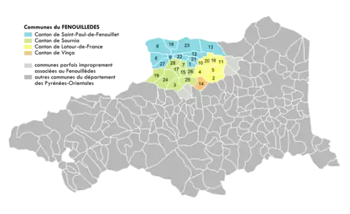 Habitualmente se considera la Fenolleda como la comarca histórica restringida a los Pirineos Orientales.[1] Algunos autores[2] incluyen la Fenolleda histórica del departamento del Aude o, desde una perspectiva geográfica solo el valle del Boulzane. Oficinas oficiales de turismo y autores básicamente franceses[3] incluyen los municipios catalanes adscritos a los cantones franceses con atribución tradicional occitana.