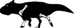 La longitud de la tibia se estima entre 31 y 33 centímetros. Visto desde el interior o el exterior, la parte inferior tiene un perfil triangular porque los maléolos, los postes de las piernas que conducen al lóbulo articular, se extienden. Este perfil es único para los leptoceratópsidos, pero no se incluyó en el diagnóstico. En vista frontal o posterior, el eje es recto, sin torcedura.[1]
