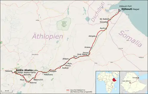 Durante la mayor parte de su longitud, el ferrocarril corre paralelo al antiguo ferrocarril de Etiopía-Yibuti. Sin embargo, el ferrocarril de ancho estándar está construido sobre un trazado nuevo y recto que permite velocidades mucho más altas. Se han construido nuevas estaciones fuera de los centros urbanos, y las antiguas estaciones han sido desmanteladas.
