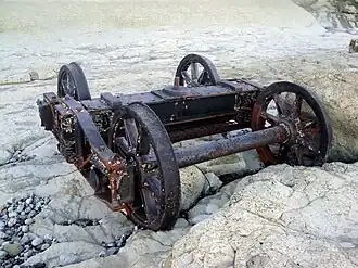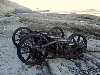 otros de los boguies abandonados en la playa costanera, tramo del ferrocarril previo a "Km 2". Pese a estar sumergido en marea alta se halla en buen estado