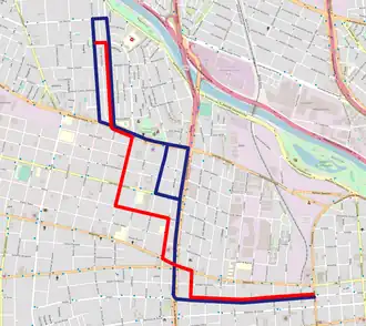 ![]() Trazado del tranvía descrito en 1911 (rojo) y 1913 (azul). | ||