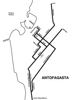 - ↑ a b c d Allen Morrison. «Antofagasta». The Tramways of Chile (en inglés). Consultado el 3 de junio de 2020.