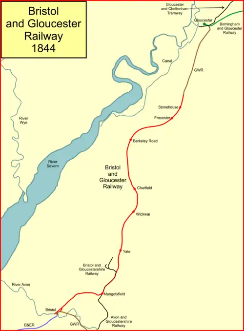 Los trenes utilizaban la Estación de Temple Meads en Bristol. Se había construido una línea de conexión de media milla en Lawrence Hill haciendo valer la autorización del 27 de junio de 1843.[2] En Gloucester, el Ferrocarril de Birmingham y Gloucester había construido una estación cuando se inauguró el 4 de noviembre de 1840. Estaba ubicada en la confluencia de lo que ahora son Station Road y Bruton Way. El Ferrocarril de Bristol y Gloucester construyó un andén en el lado norte de la estación. Su ruta se curvaba desde el sur y el sureste, de modo que las rutas respectivas se cruzaban al acercarse a las estaciones. Había seis trenes de pasajeros en cada sentido diariamente, aunque desde el principio no estuvo disponible la vía doble en todo momento, aunque se habilitó después de un corto tiempo. El tráfico de carbón comenzó a operar el 9 de septiembre de 1843.[2][9]