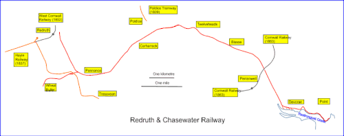 La Ley especificaba que la línea principal iba de Redruth a Point, con varias ramas, incluida una de Twelveheads a Chacewater. También se realizarían mejoras en el puerto de Narabo (cerca de Devoran).[1][3] La ruta pasaba por Carharrack y bajaba por Carnon Valley, por Bissoe.[4]