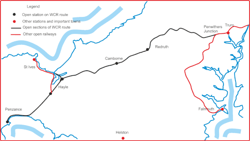 - Cuando el Ferrocarril de Cornualles conectó su estación de Truro con la línea del Oeste de Cornualles en 1870, la mayoría de los trenes de pasajeros del Ferrocarril del Oeste de Cornualles se desviaron hacia ella; sin embargo, era propiedad y estaba operada en su totalidad por la compañía del Ferrocarril de Cornualles.