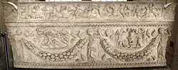 El diseño fue empleado por los antiguos griegos y romanos y formó en gran parte la decoración principal de altares, frisos y paneles.[1] Los extremos de las cintas forman a veces arcos o curvas torcidas. Su origen es probablemente debido a la representación en piedra de las guirnaldas de flores naturales, frutas, etc. que eran colgadas sobre el umbral de una entrada los días de fiesta o suspendidas alrededor del altar.