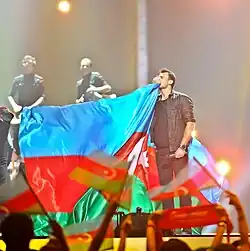 El cantante Emin Agalarov besa la bandera azerí durante su actuación como invitado en la final del concurso.