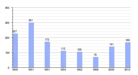 Los datos demográficos contemplados en este gráfico de la comuna de Feuguerolles-sur-Seulles,[4] se han cogido de 1800 a 1968 de la página francesa EHESS/Cassini, y los demás datos de la página del INSEE.[5]