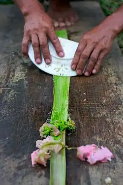 La hoja se corta y se separa de ella la fibra. Éstas son largas y algo rígidas. Cada hebra de la fibra de piña se raspa a mano y se anuda una a una para formar un filamento continuo tejido a mano, convirtiéndose en una tela de piña.