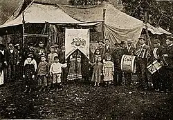 A lo largo del siglo XIX, la celebración del 18 de septiembre se realizaba al aire libre y a campo abierto,[58]​ donde se instalaban provisionalmente las chinganas[n 5]​ —especie de tabernas con piso de tierra, puntales de madera y techo de ramas que servían como lugares de sociabilidad y esparcimiento donde se vendían alimentos y bebidas, se cantaba y bailaba— con una bandera chilena flameando al tope.[59]​ Allí se consumían carnes asadas, pescados y empanadas; chicha, aguardiente y vino;[14]​ y se bailaban la cueca, el cuándo, la refalosa y la zamba, entre otros.[59]​ En Santiago, las Fiestas Patrias se festejaban en «La Pampilla»,[n 6]​ donde se congregaban todas las clases sociales de la capital, encabezadas por el presidente de la República.[58][60]