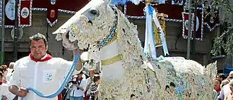 - Se bendice la bandeja de flores con el vino que ha portado el caballo, así como las flores que se entregaron a la Patrona el día anterior en la Ofrenda. Esta vez, la Santísima Cruz las devuelve bendecidas al pueblo de Caravaca.