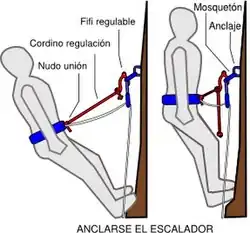 Para esta función es recomendable el uso de una fifi regulable. Esta, en su parte conectora, dispone de un sistema de agujeros de regulación y antiretorno del cordino que permite ajustar la distancia que une al escalador con el anclaje a la pared. Una vez anclado se tira de su parte libre para ajustar la distancia a la pared. La parte libre del cordino va rematada con un nudo de seguridad que además servirá de tope a la mano para tirar de él.