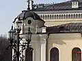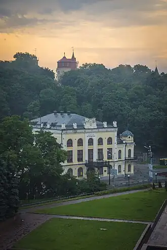 La Filarmónica Nacional es un edificio de ladrillo de dos plantas, obra del arquitecto kievita Vladimir Nikolayev,[4]​ cuyos rasgos más distintivos son las dos torres de media altura a ambos lados de la fachada y sus aleros recubiertos de metal.[5]