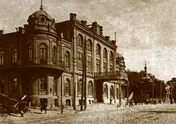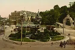 Para finales del siglo xix, el desarrollo cultural de Kiev —entonces importante centro comercial del suroeste del Imperio ruso— estaba en su apogeo. En 1881, el Consejo de Ancianos de la Asamblea de Mercaderes (o de Comerciantes) de Kiev consiguió el permiso para establecer un área recreativa en la Tsarskaya («plaza del Zar», actualmente la plaza Europea), donde un año después (1882) se erigió la Casa del Mercader. El edificio, construido en tiempo récord para la época, se ubicada en una zona verde y pintoresca conocida como Jardines del Zar (diseñados por Francesco Bartolomeo Rastrelli más de un siglo antes),[3]​ en las elevaciones que constituyen las orillas del Dniéper, paralelo a la Bajada de San Volodymyr, que se convertiría en ese momento en el Jardín de los Comerciantes.[5][3]