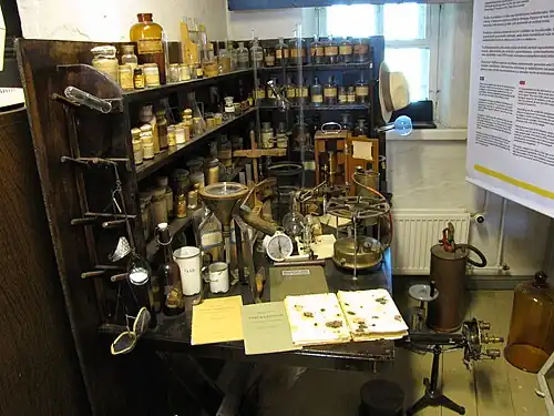 La palabra química derivó de chymia, un término acuñado por Andreas Libavius para describir las prácticas de laboratorio en contraposición a la alquimia esotérica.[55] Libavius escribiría Alchemia (1597), uno de los primeros libros de química, el cual es descrito como el primer libro de texto práctico en la historia de la química.[56]