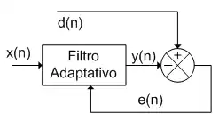 La estructura de un filtro adaptativo es un sistema al que le llegan dos señales: x(n) y e(n), esta última se llama señal de error y viene de la resta de una señal a la que se llama señal deseada, d(n), y otra que es la salida del filtro y(n). A los coeficientes del filtro se les llama w(n), que son los que multiplican a la entrada x(n) para obtener la salida.