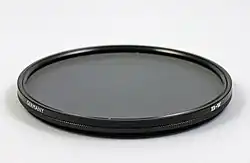- Polarizador: Eliminan reflejos indeseados en agua, cristales y otras superficies (excepto en los metales, como los objetos cromados) y produce colores más saturados al seleccionar los rayos de luz que entran en el lente de cámara fotográfica.[1] El efecto puede cambiarse rotando una de las dos partes de que se compone el filtro y variando la orientación. Se percibe mejor en teleobjetivos u objetivos normales que en gran angulares. Los hay lineales o circulares: