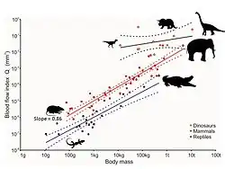 La evaluación de las tasas metabólicas se complica por la distinción entre las tasas en reposo y en actividad. En todos los reptiles modernos y en la mayoría de los mamíferos y aves, las tasas máximas durante la actividad máxima son de 10 a 20 veces más altas que las tasas mínimas en reposo. Sin embargo, en algunos mamíferos estas tasas difieren en un factor de 70. En teoría, sería posible que un vertebrado terrestre tuviera una tasa metabólica de reptil en reposo y una tasa similar a la de un pájaro mientras trabaja a toda máquina. Sin embargo, un animal con una tasa de reposo tan baja no podría crecer rápidamente. Los enormes saurópodos herbívoros pueden haber estado moviéndose tan constantemente en busca de comida que su gasto de energía habría sido muy similar, independientemente de si sus tasas metabólicas en reposo eran altas o bajas.[60]