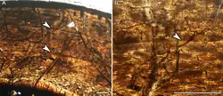 - Tripas que probablemente contenían microorganismos endosimbióticos que digieren la celulosa, ya que ningún animal conocido puede digerir este material resistente directamente[14]