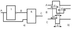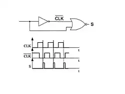 Al pasar la señal A de bajo a alto, tras el retardo, t1, propio por la puerta NO, su salida, B, conmutará a bajo. Pero durante dicho retardo, ambas entradas de la puerta NO Y quedan a alto, lo que hará que, transcurrido su tiempo de retardo, t2, su salida proporcione un impulso negativo de duración t1. De este modo se indica que en la entrada A se ha producido un flanco de subida.