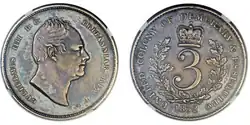![]() Moneda de 3 florines de la Colonia Unida de Demerara-Esequibo (y Berbice), con el rostro del rey Guillermo IV del Reino Unido de 1832, o bien de Guayana británica desde 1836 | |||||