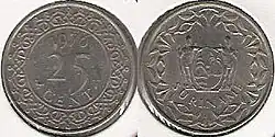 | Billetes | ƒ5 · ƒ10 · ƒ25 · ƒ100 · ƒ500 · ƒ1000 · ƒ5000 · ƒ10000 · ƒ25000 | ||||