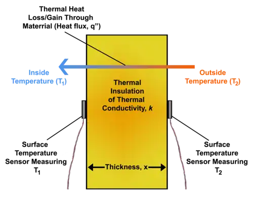 La medición del flujo de calor se puede realizar de diferentes maneras. Un método comúnmente conocido, pero a menudo poco práctico, se realiza midiendo una diferencia de temperatura sobre una pieza de material con conductividad térmica conocida. Este método es análogo a una forma estándar de medir una corriente eléctrica, donde uno mide la caída de voltaje sobre una resistencia conocida. Por lo general, este método es difícil de realizar, ya que la resistencia térmica del material que se está probando a menudo no se conoce. Se requieren valores precisos para el espesor del material y la conductividad térmica para determinar la resistencia térmica. Usando la resistencia térmica, junto con las mediciones de temperatura en ambos lados del material, el flujo de calor puede calcularse indirectamente.