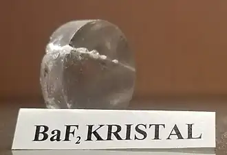 El fluoruro de bario (BaF2) es un compuesto inorgánico con la fórmula BaF2. Es un sólido incoloro que se encuentra en la naturaleza como el raro mineral frankdicksonita.[2] En condiciones estándar, adopta la estructura de fluorita y, a alta presión, la estructura de PbCl2.[3] Al igual que el CaF2, es resistente e insoluble en agua.