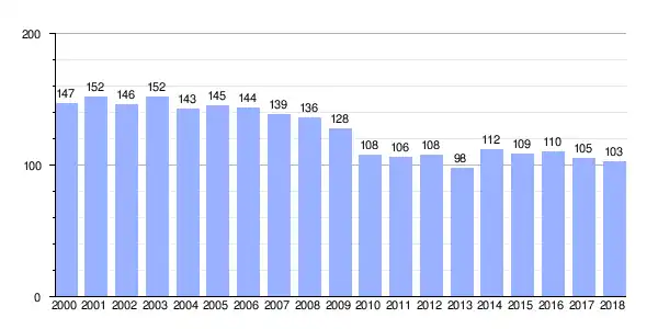 | Gráfica de evolución demográfica de Folladela[3] entre 2000 y 2018 |
