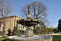 La pila circular de la fuente, el pedestal con decoración en forma de conchas y la pila sostenida por los delfines adornados con hojas de palma y las cabezas de leones escupiendo agua, son idénticas a las otras tres fuentes instaladas en los jardines de los Campos Elíseos de Jacques Hittorff:
